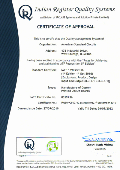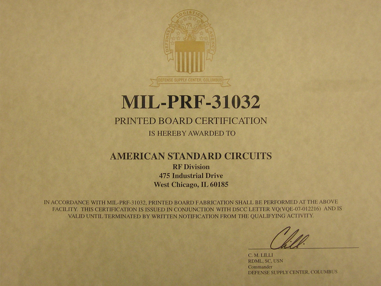 This specification intends to allow the device manufacturer the freedom to enact best commercial practices while still delivering products that meet military performance needs. Certification to this standard is intended for manufacturers of the kinds of devices mentioned above that wish to be suppliers to the Department of Defense. ASC has MIL Certification on the following products: FR4, Polyimide, Flex, Rigid-Flex, Pure Hydrocarbon and Hydrocarbon Hybrid.