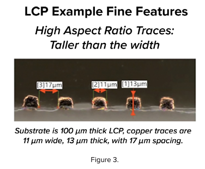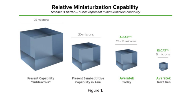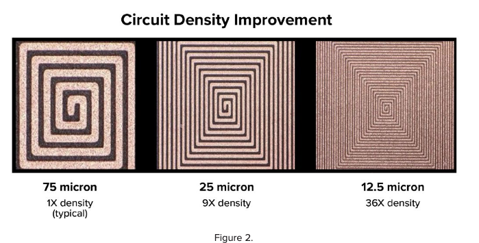 Figure 1 shows what happens when you can achieve ultra-fine features with this technology. Current subtractive technology is around 75 microns, or 3-mil line and space. Some folks can get down to 2 and 2, but it isn’t without some challenge and yield penalty. This technology allows us to get below 25 microns, a present semi-additive capability in